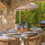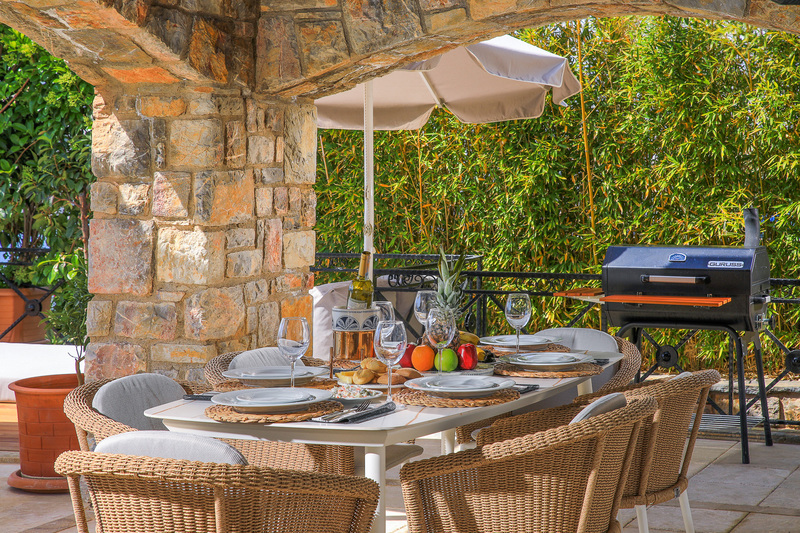 Pool terrace area – there are two lovely shaded areas adjacent to the stunning split-level infinity pool. The first is the dining area which seats eight, and the other is a comfortable seating set with two arm chairs. The pool has rattan sun-loungers arranged around it and a large cantilevered umbrella, plus a top of the range BBQ.