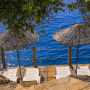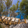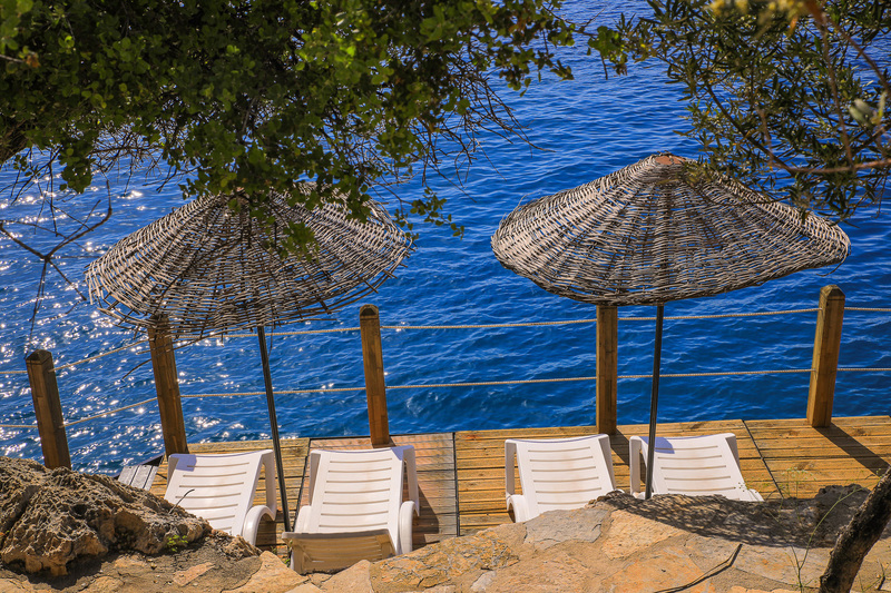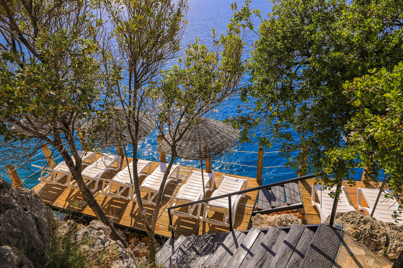 Private beach platform - steps lead down from the garden, across a track and then further steps cut into the cliff side (shaded by olive trees) lead down to sunbathing platforms set into the rocks; at sea level a decked platform is furnished with sun-loungers, parasols and scatter cushions. Steps lead directly into the sea.