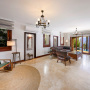 Lounge – the lounge has a leather sofa, coffee table, rocking chair, plus a wall-mounted flat screen TV facing the sofa. The courtyard garden is accessed from one end of the lounge and at the opposite end, there are three sets of doors leading out to the pool terrace.