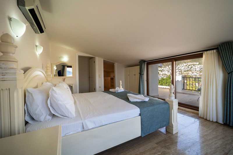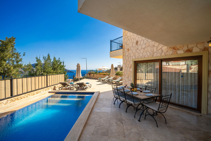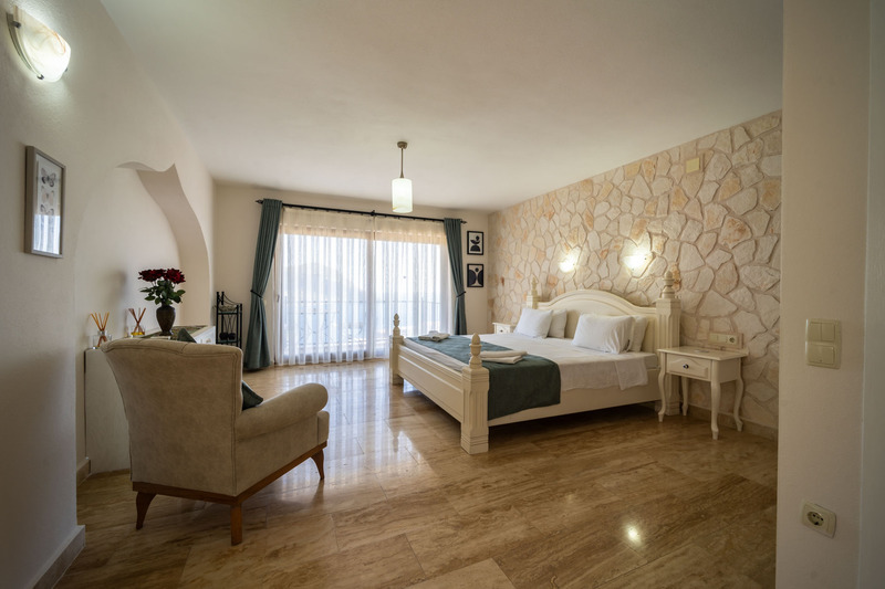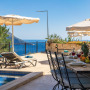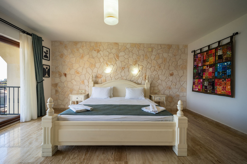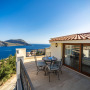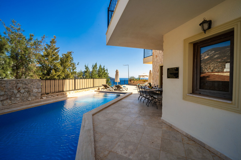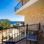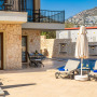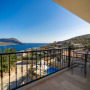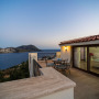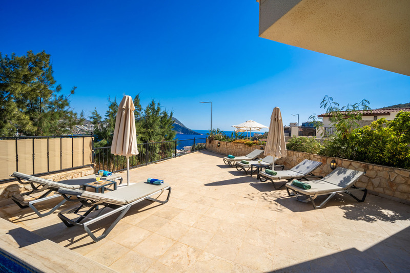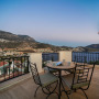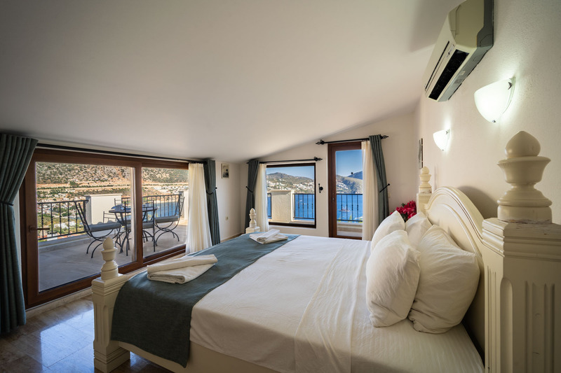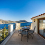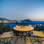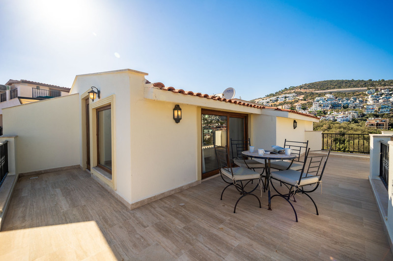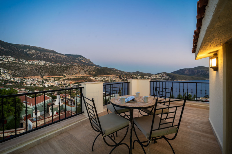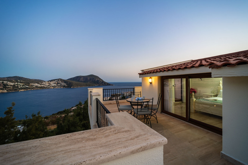 lead to the L-shaped balcony that can be accessed on either side with views of the mountains and Kalkan Bay below.