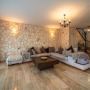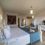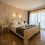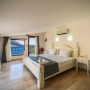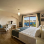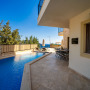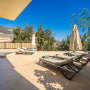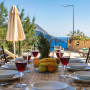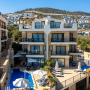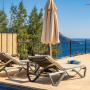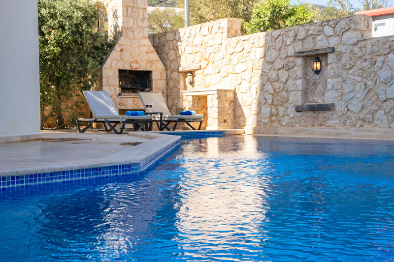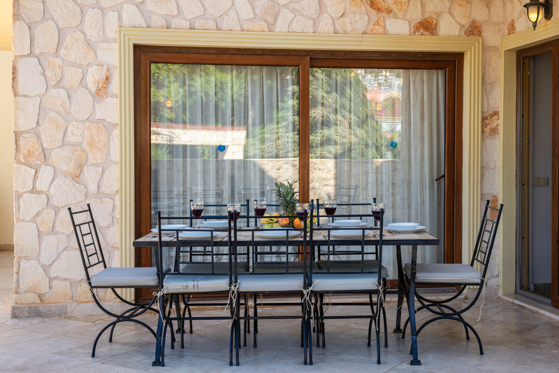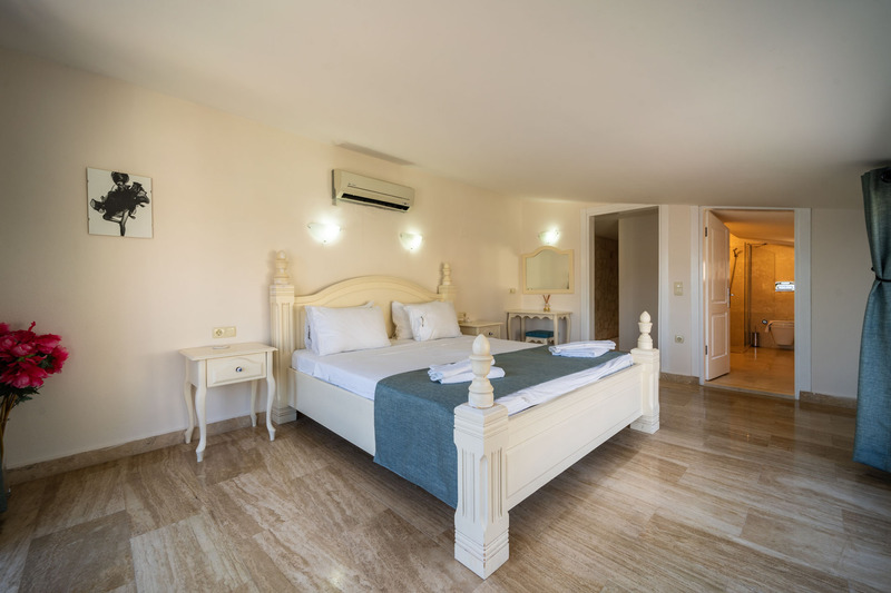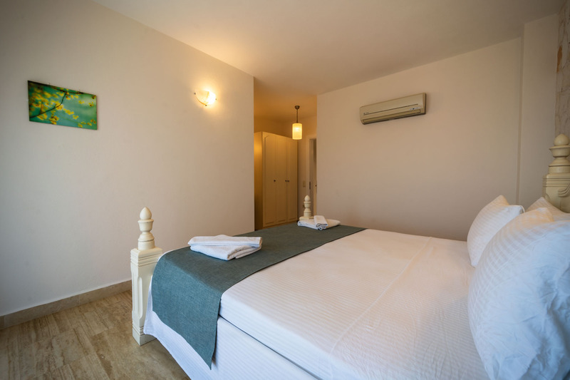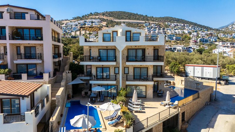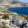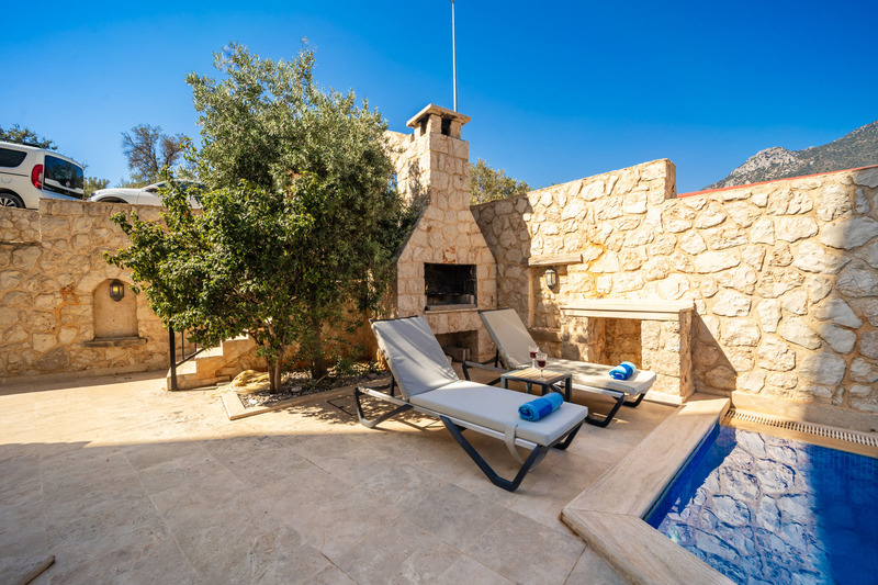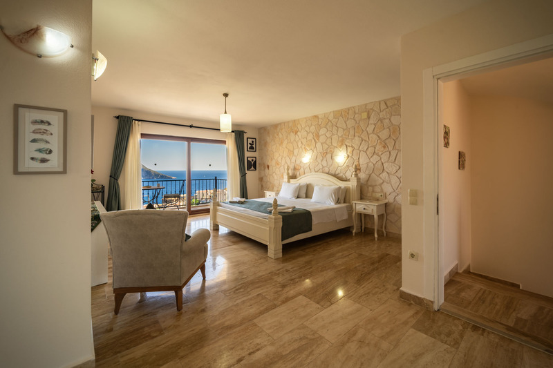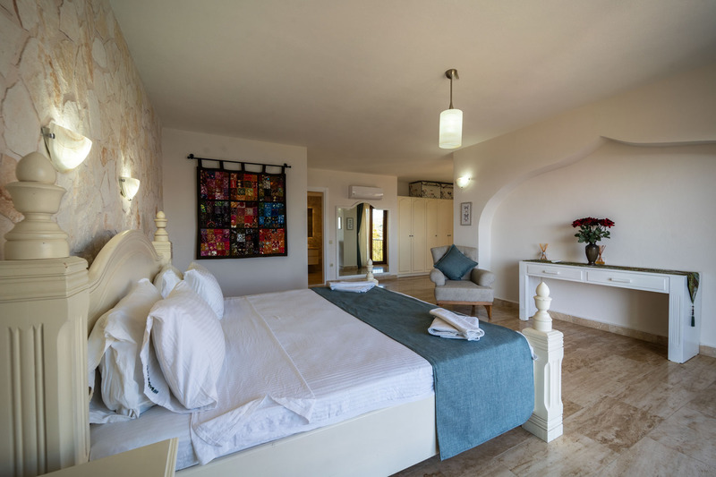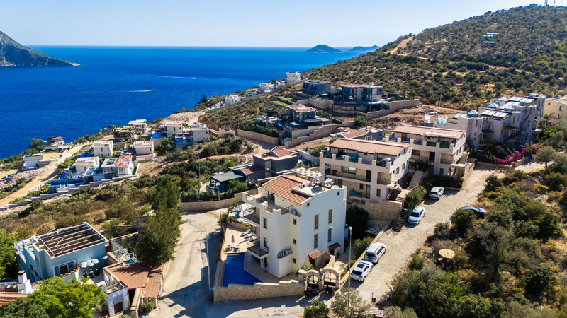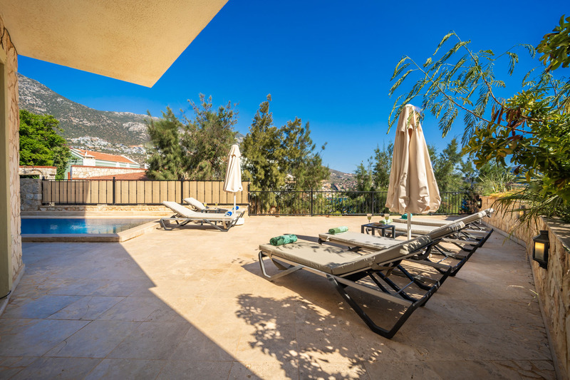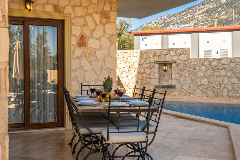 lead to the L-shaped balcony that can be accessed on either side with views of the mountains and Kalkan Bay below.