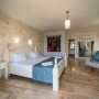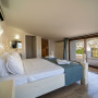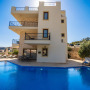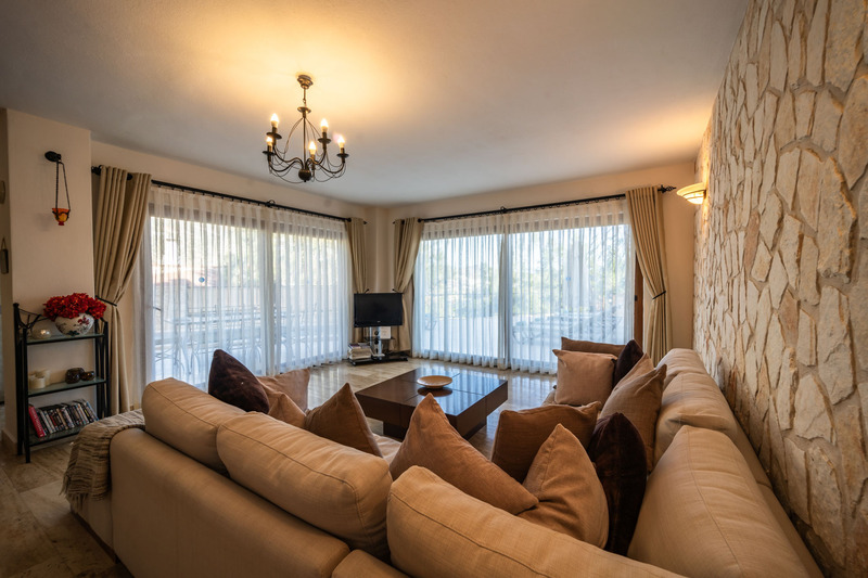 The living area has a large L-shaped sofa set around a coffee table with TV and sliding doors open out onto the pool terrace.
