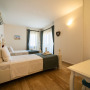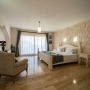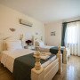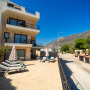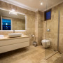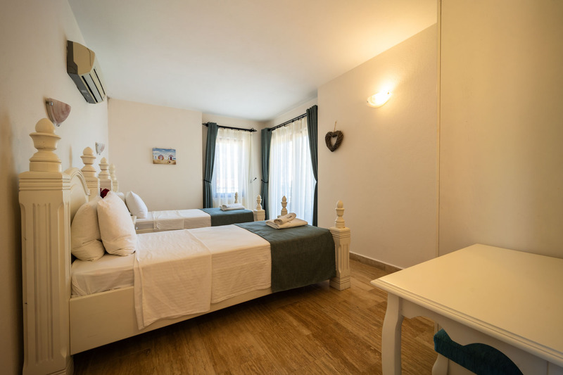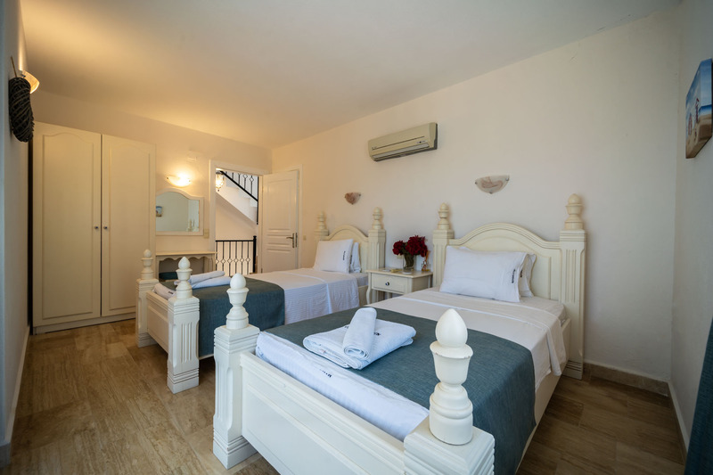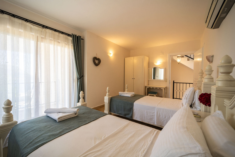The second bedroom on this floor is a twin with an en-suite shower room and within the room, a wardrobe and dressing table with stool. Sliding doors lead to a private L-shaped balcony with two chairs and a table overlooking the mountains on one side and the Bay of Kalkan below.