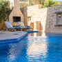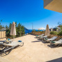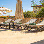 The large L-shaped pool has integral steps with 8 sun loungers with parasols spaced around the pool.