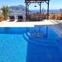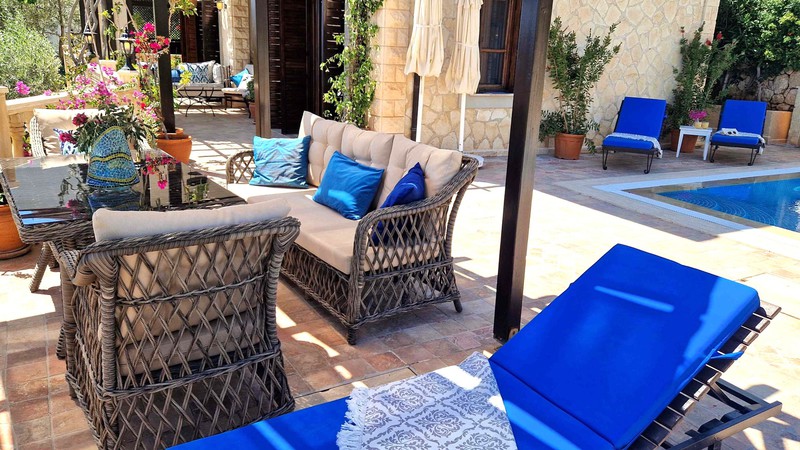 The freshwater pool is to the side of the villa and accessed by roman steps. There are 4 sun loungers with side tables and 2 parasols next to it. Under a wooden pergola is a comfortable dining area with a rattan cushioned sofa and two armchairs. There is also a built in BBQ to enjoy al-fresco dining.