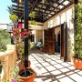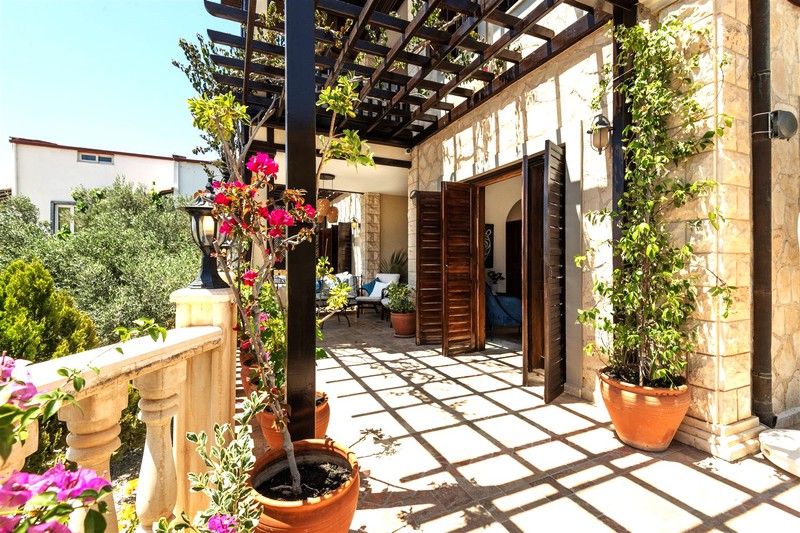 The villa is surrounded by a terrace with mature plants and terracotta pots offering guests some privacy from the surrounding villas.