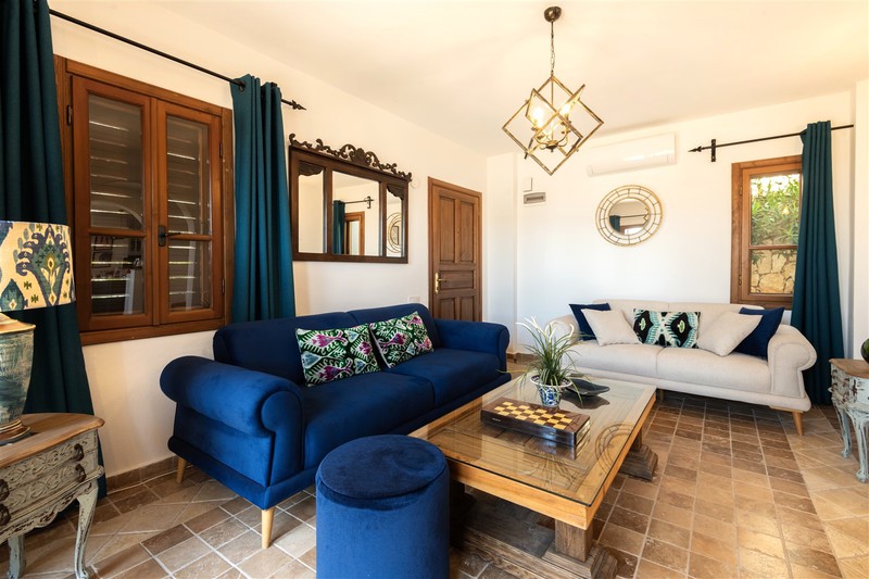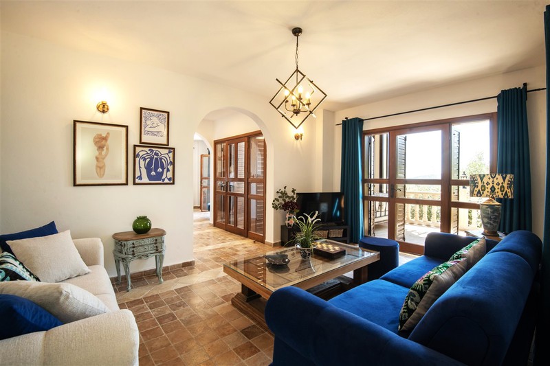 As you come through the wooden front door to the side of the villa, you enter the light and airy living room with two sofas and two armchairs arranged around a coffee table with a smart TV with a firestick for guests use.