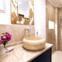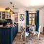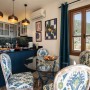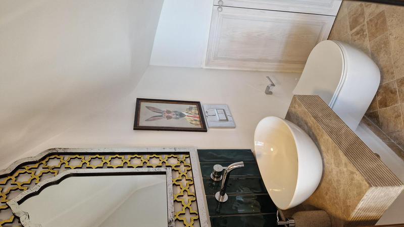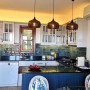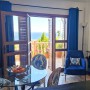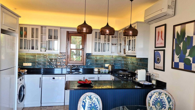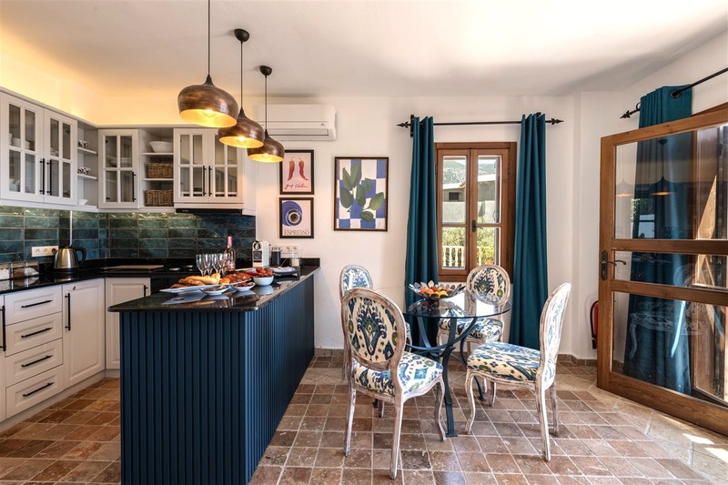 The beautiful, teal-coloured tiles and black marble tops in the well-equipped kitchen is through the hallway offering fabulous views while you prepare a meal. Within the kitchen is a large fridge-freezer, microwave, electric oven, gas hob with extractor fan, dishwasher, washing machine, Nespresso coffee machine, water cooler, toaster and kettle. Next to the kitchen is a round glass dining table with 4 elegant chairs. There is also an armchair to relax in as well.