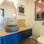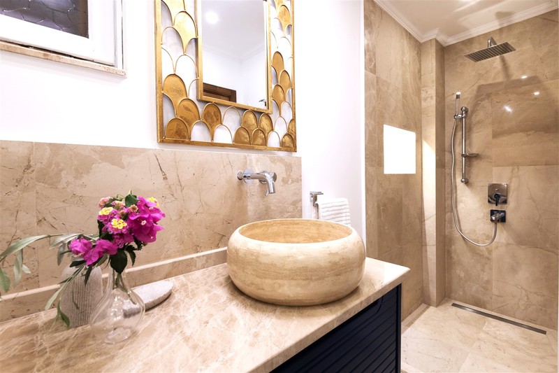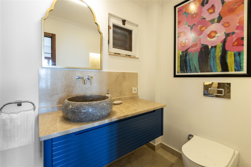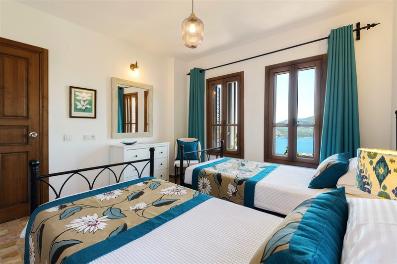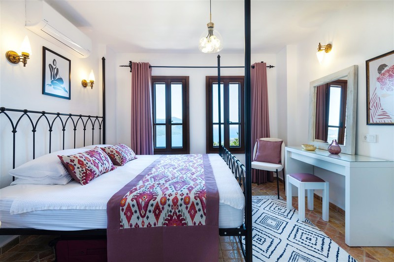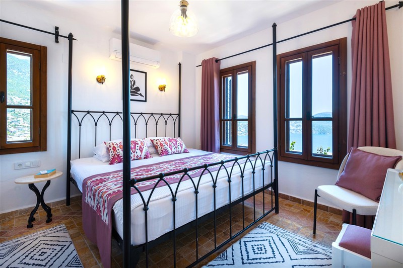 The double bedroom to the left has a wrought iron poster bed with an ensuite wet room style shower with a stone basin and WC. Within the room is a built-in wardrobe, dressing table with a stool and an armchair to relax in. The front windows look out over Kalkan Bay and the side window looks over the pool terrace and gardens.