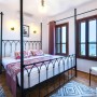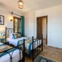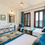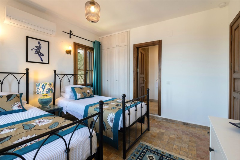 There are two bedrooms on this level – the twin room to the right can be made into a double on request. Within the room are two wrought iron single beds with a side table with a decorative lamp. There is also a fitted wardrobe and a chest of draws with a mirror and an armchair. The windows look out to the bay and the side window looks out onto the olive groves. The ensuite shower room has a wet room style shower with a stone basin and WC.