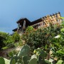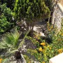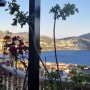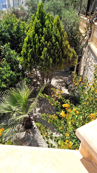 The property is accessed through a metal gate at street level and then there are staggered steps that lead up to the front door. These also go past the lower terraced garden with fruit trees and a table with chairs to enjoy the sea and mountain views.