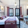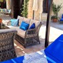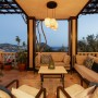 The landing between the bedrooms has a glass door leading to the 'kosk style' covered balcony with a U-shaped sofa with decorative cushions.