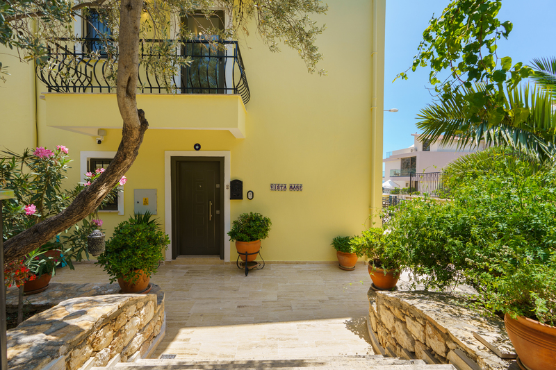 A few steps from the street through a metal gate, lead down to the front door on the top terrace.