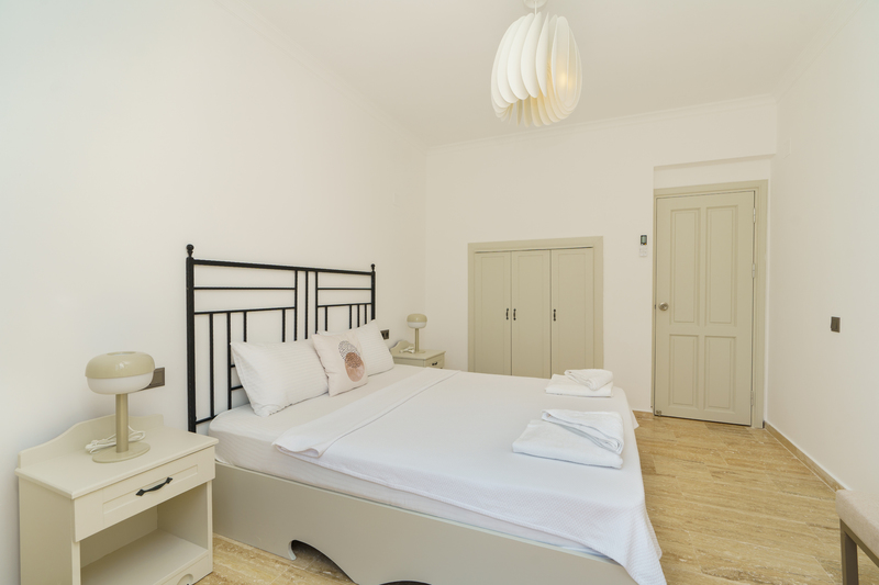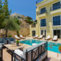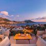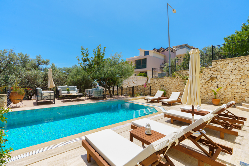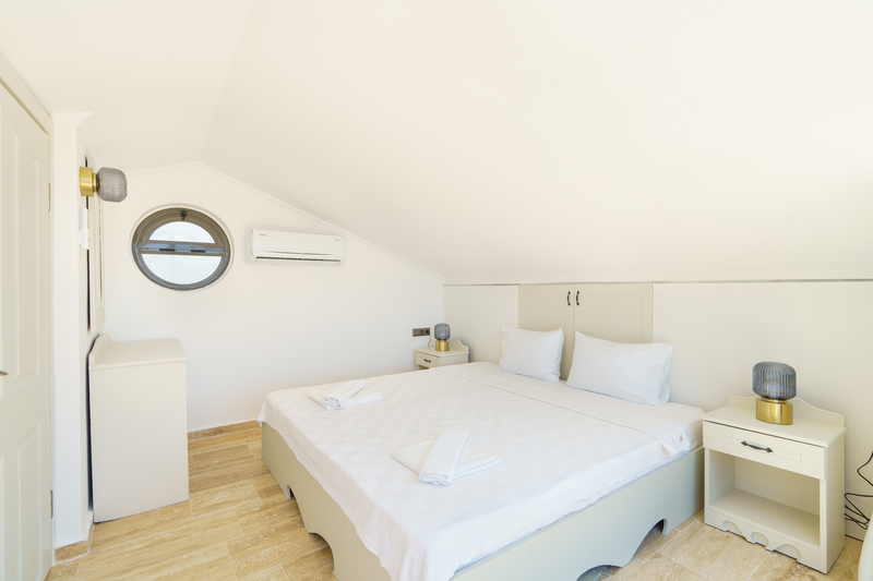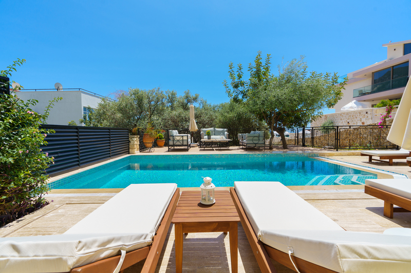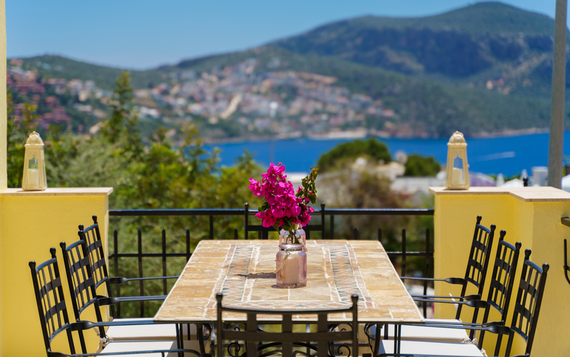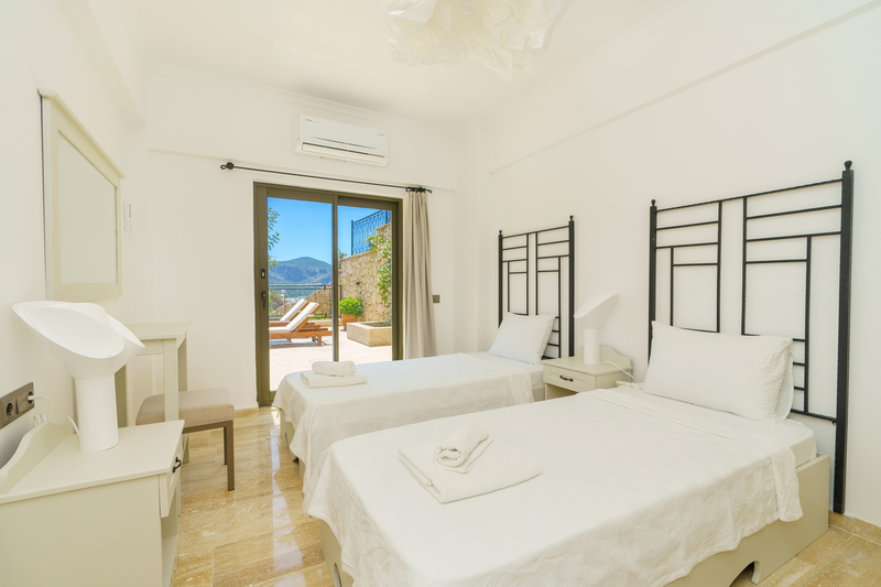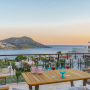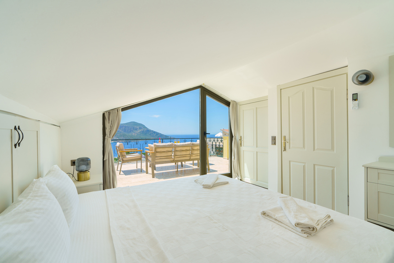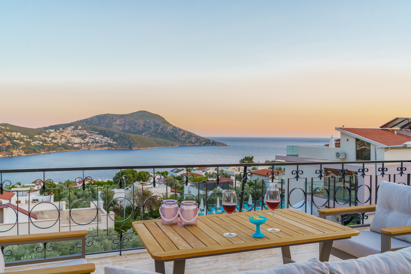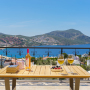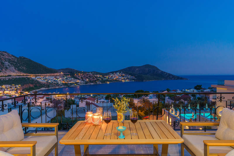 On the roof terrace is a sofa and two armchairs spaced around a coffee table to make the most of the panoramic views across Kalkan to the bay.