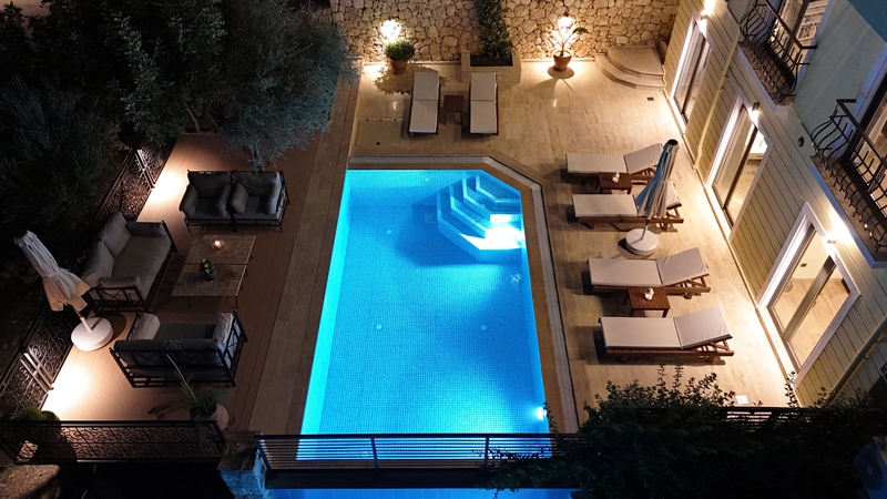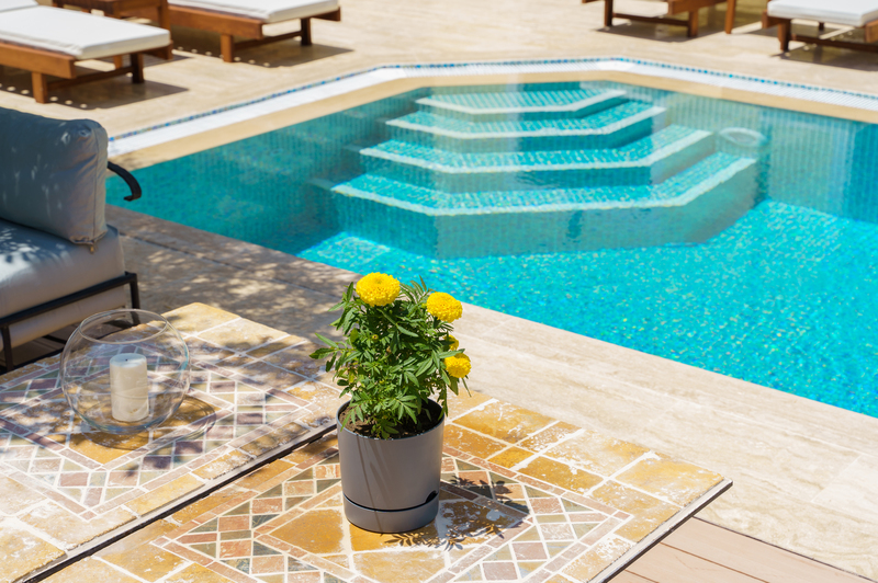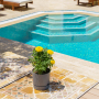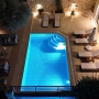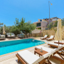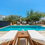 The freshwater pool is accessed via roman steps with 6 sun loungers spaced around it with 3 side tables and two parasols.