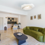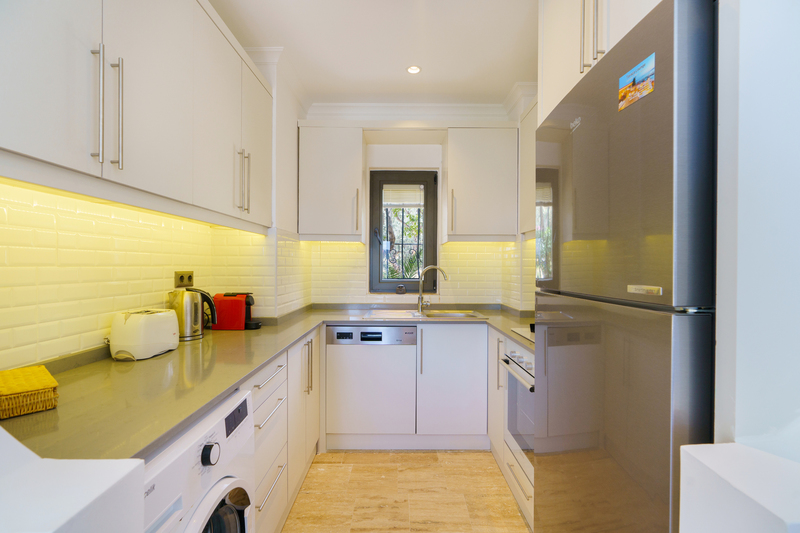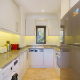 The oval dining table seats 6 guests with a well-equipped galley kitchen just behind it. There is a large fridge freezer, dishwasher, washing machine, electric oven, gas hob with an extractor fan, water cooler, Nespresso coffee machine, kettle and toaster.