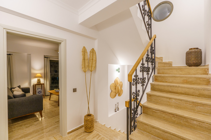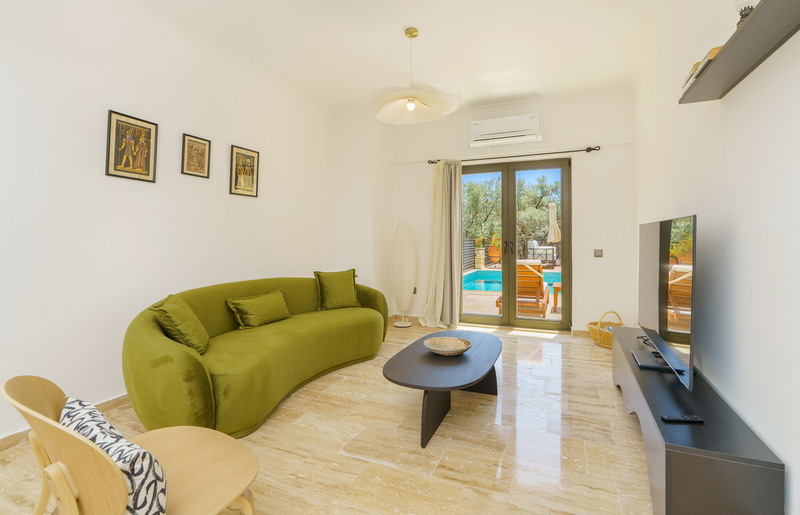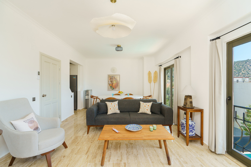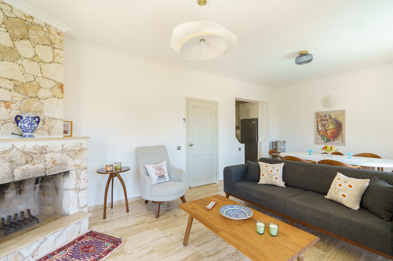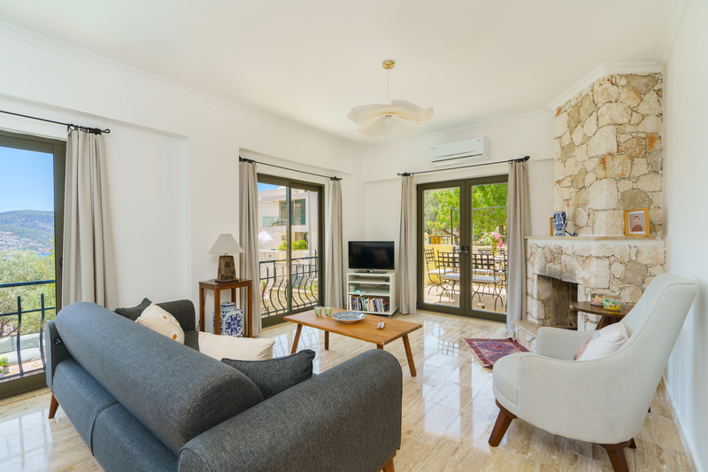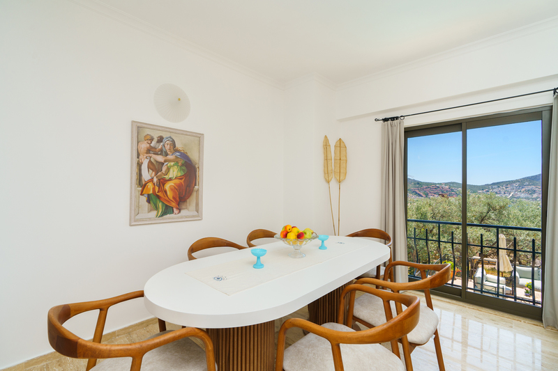 In the entrance hallway are stone stairs with wrought iron and wood banisters leading to the floors above and below. Straight ahead the door leads into an open plan living area with a sofa and armchair spaced around a coffee table with a decorative fireplace and small Smart TV. There are sliding doors to the front of the living room and dining area that lead to two Juliette balconies offering views across the olive grove beyond the garden and Kalkan Bay. Sliding doors off the side of the living room lead out to the top terrace with an outside dining table that seats 8 guests comfortably with a parasol and a charcoal barbeque to enjoy al fresco dining. External stone steps lead down to the pool terrace as well.