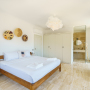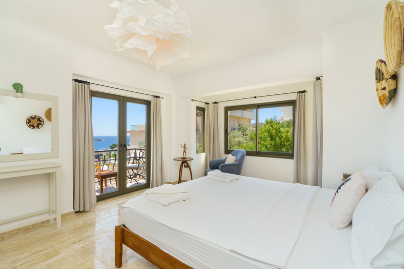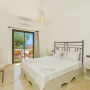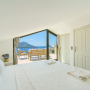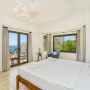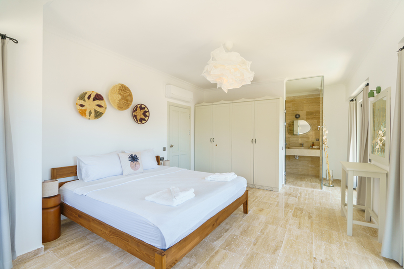 Under low eaves is the second double bedroom with two side tables with bedside lights and a half dresser with a wall mounted mirror. One side of the room is all glass with a door leading out to the pool terrace, offering wonderful vistas.