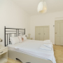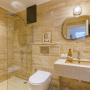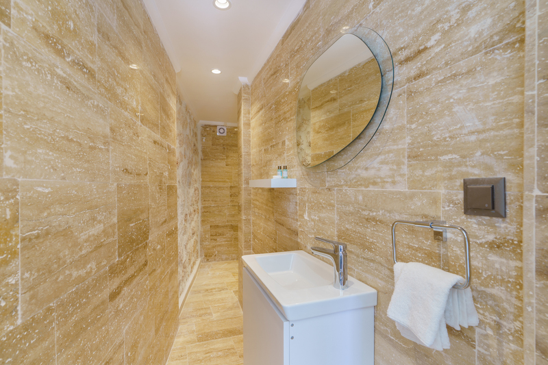 Within the room is a large double bed with two side tables with bedside lights and a cosy armchair by the picture window. A dressing table with a chair has two balconies on either side through French doors with two chairs to enjoy the sea views across the roof tops. There are also two large built-in wardrobes with a full-length mirror on one of the inside doors. The ensuite shower room with WC and basin is accessed through a glass door off the bedroom.