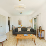 The second living room and kitchenette is on this floor offering a breakfast bar with 3 stools, a drinks fridge, and a kettle so guests can make beverages to take out onto the pool terrace. The living room has a large sofa and wooden chair spaced around a coffee table with a large smart TV. Glass doors lead out to the pool terrace.